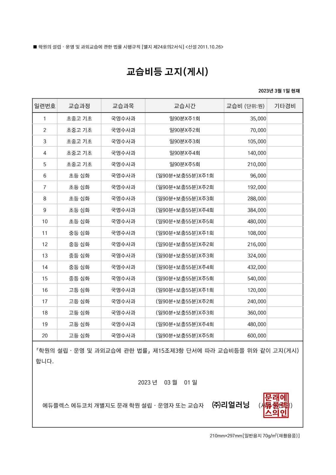 리얼러닝 에듀플렉스 보라매/문래점의 필수 공개정보(학원명칭 및 등록번호 / 학원운영등록증 / 수강료게시표 및 반환기준)입니다.